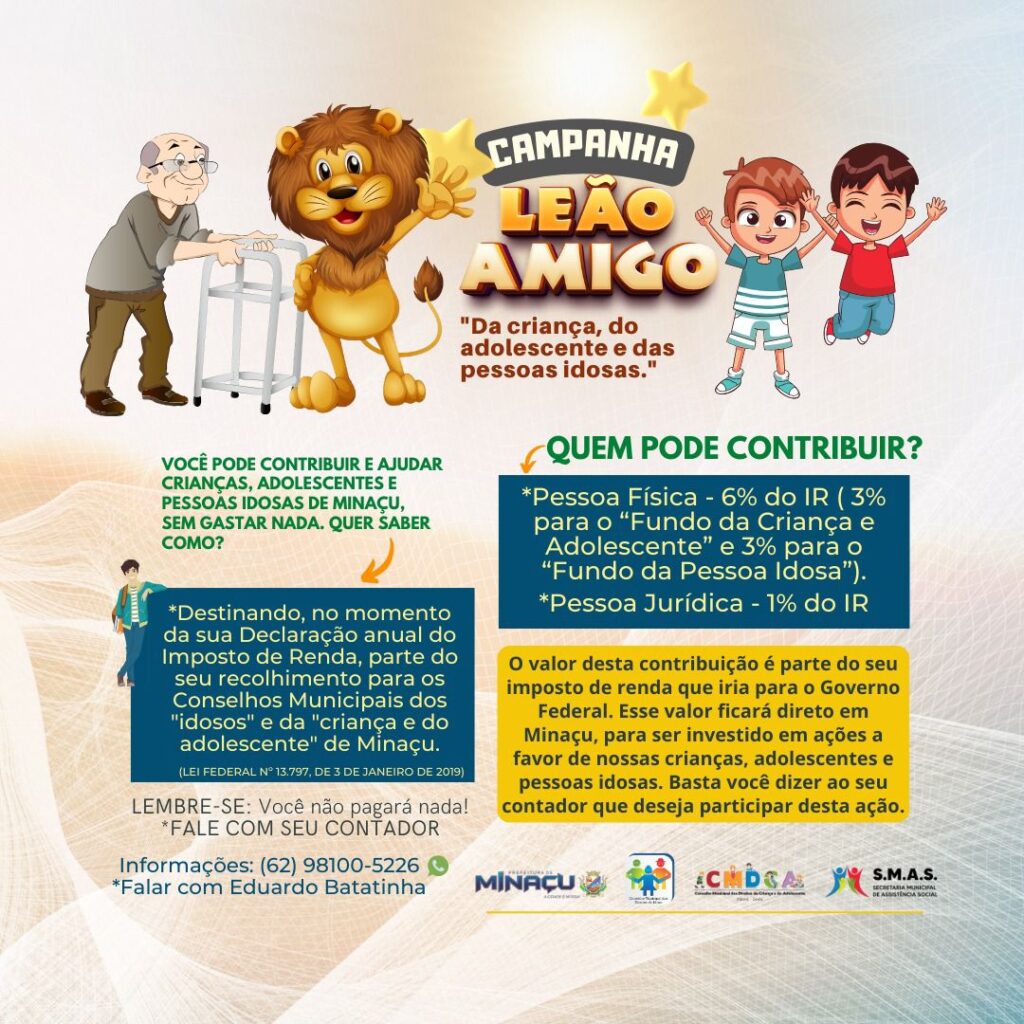 Campanha Leão amigo da criança, do adolescente e das pessoas idosas. Você pode contribuir e ajudar crianças, adolescentes e pessoas idosas de Minaçu, sem gastar nada. Quer saber como? Destinando, no momento da sua declaração anual do imposto de renda, parte do seu recolhimento para os conselhos municipais da “criança e do adolescente” e dos “idosos” de Minaçu. Lembre-se: você não pagará nada! É só falar com seu contador e ele sabe como providenciar.